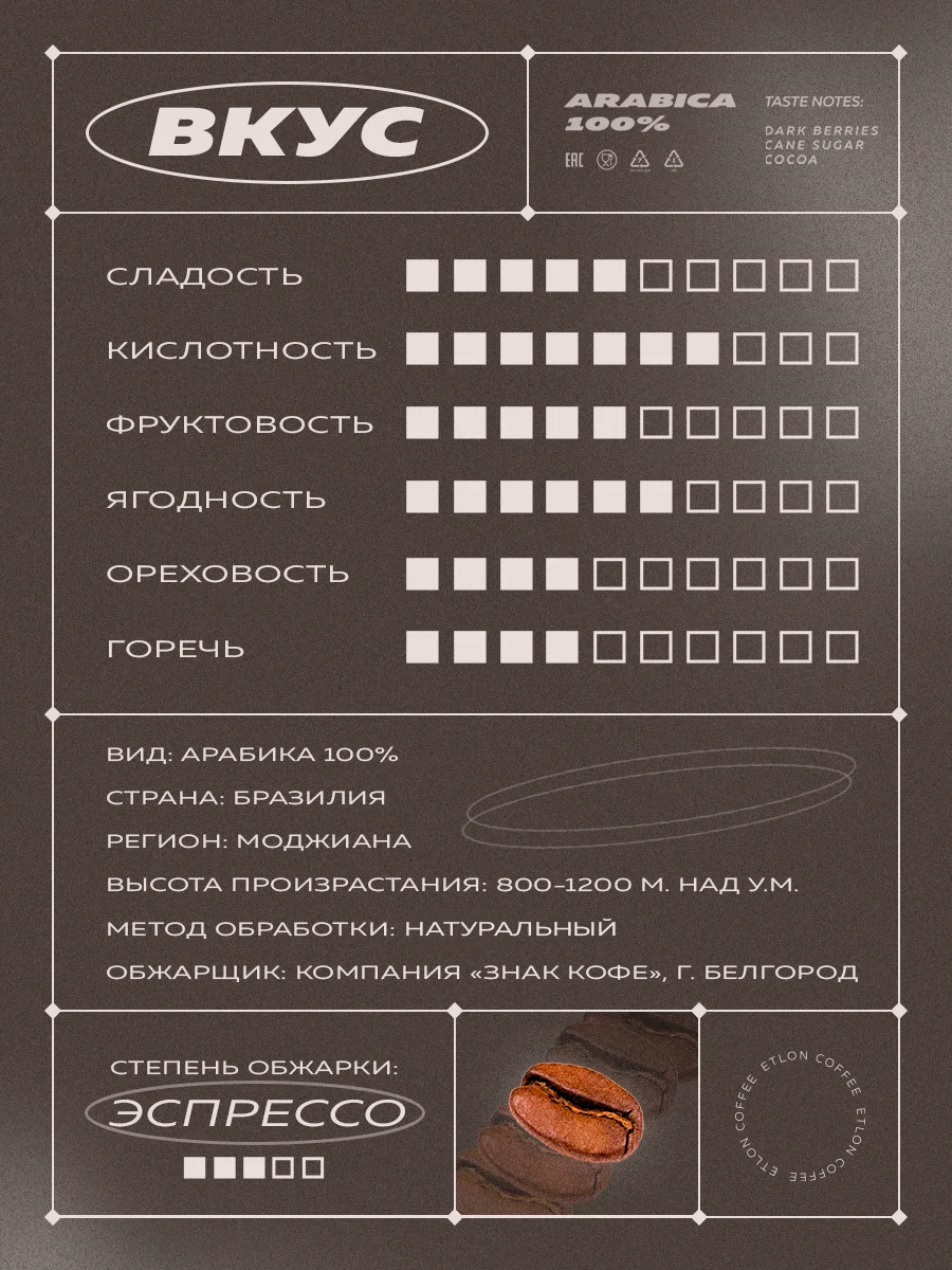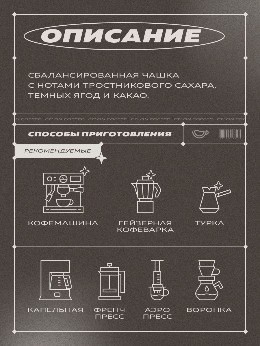 Сбалансированная яркая чашка с нотами тростникового сахара, тёмных ягод и какао.